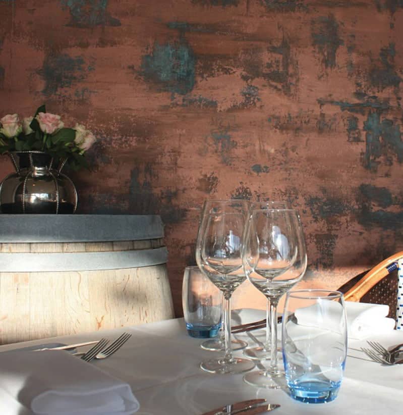 Decorative coating with green-copper oxidation effect, for interiors and exteriors.